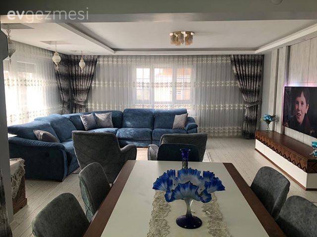 Renklerle klasik stile yaklaşan dekor, tam olarak klasik de değil! Modern ile klasiğin harmanı bu salonda, renklerin iddialı olanları serinlerle birleştirilmiş.