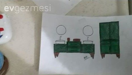 Çözümü bulan kişi hemen yeni banyo dolabının da tasarımını da yapmış: Önce rengi değişecek , sonra biraz çıta eklenecek ve en sonunda da enine genişleyen alana iki lavabo sığdırılacak.