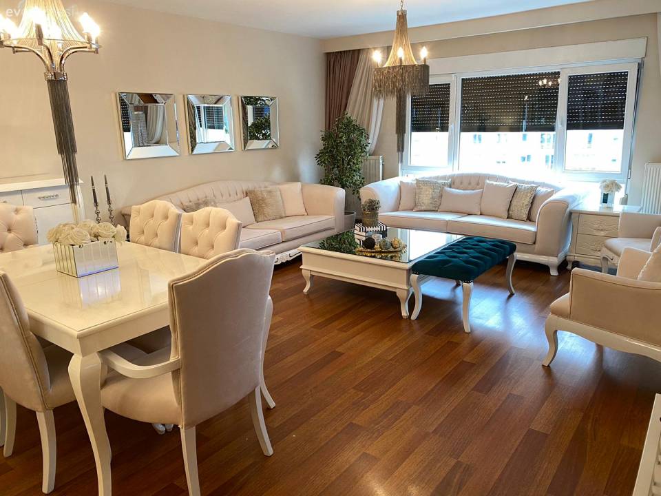 Salondan sonra bizi karşılayan salon, yine beyazın asaletinden eksik bırakılmamış. Bütün dolapları kuşatan bu renk, u tipi mutfağı olduğundan geniş göstermeyi de başarmış.