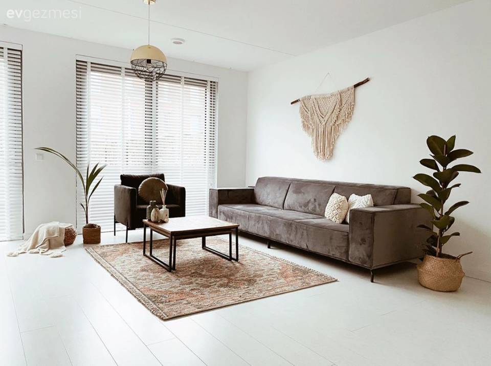 Salondaki sakin görünüme sıcaklık ve şıklık da katmak isteyen ev sahibimiz, ortada kullandığı geometrik sehpası ve ev bitkileriyle bu amacına ulaşmış.