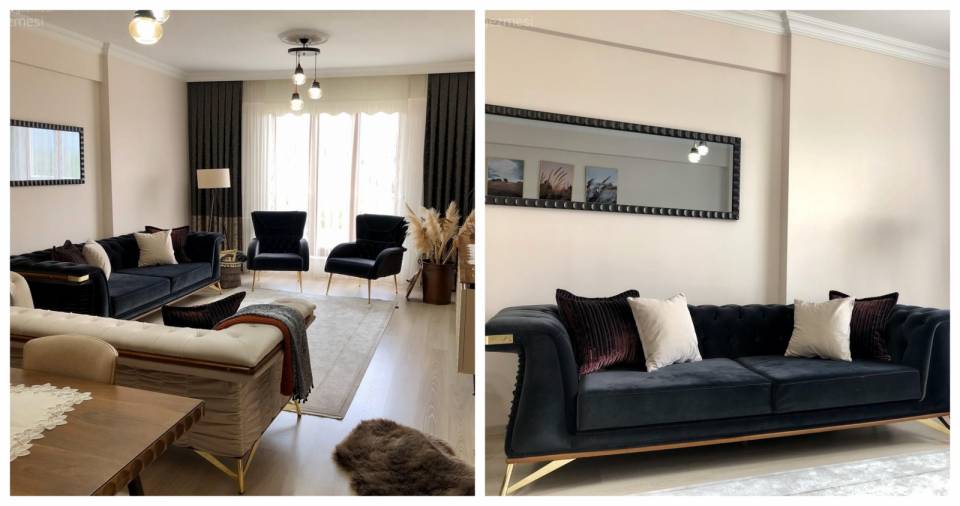 Tarz olarak modern stilin daha çok öne çıktığı evde, dekoru kişiselleştiren yorumlar da eksik edilmemiş: Modern chesterfield koltuklar, altın detaylı mobilyalarla tamamlanmış. Ortama ışıltı katan aksesuarlar da birçok köşeden belirmiş.