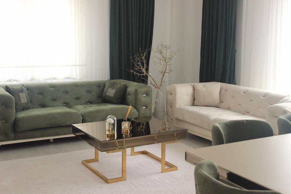 Salon için konforlu mobilyalar seçmeye özen gösteren ev sahibimiz, çözümü modern chesterfield koltuklarda bulmuş.