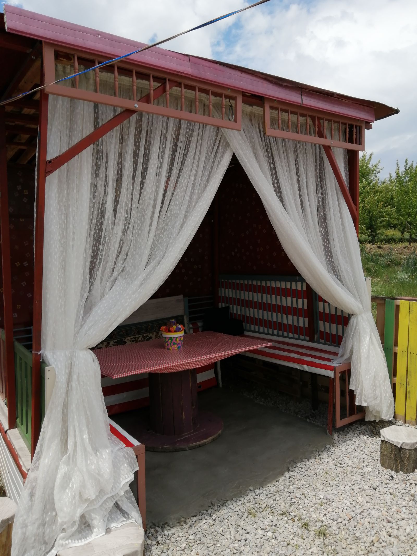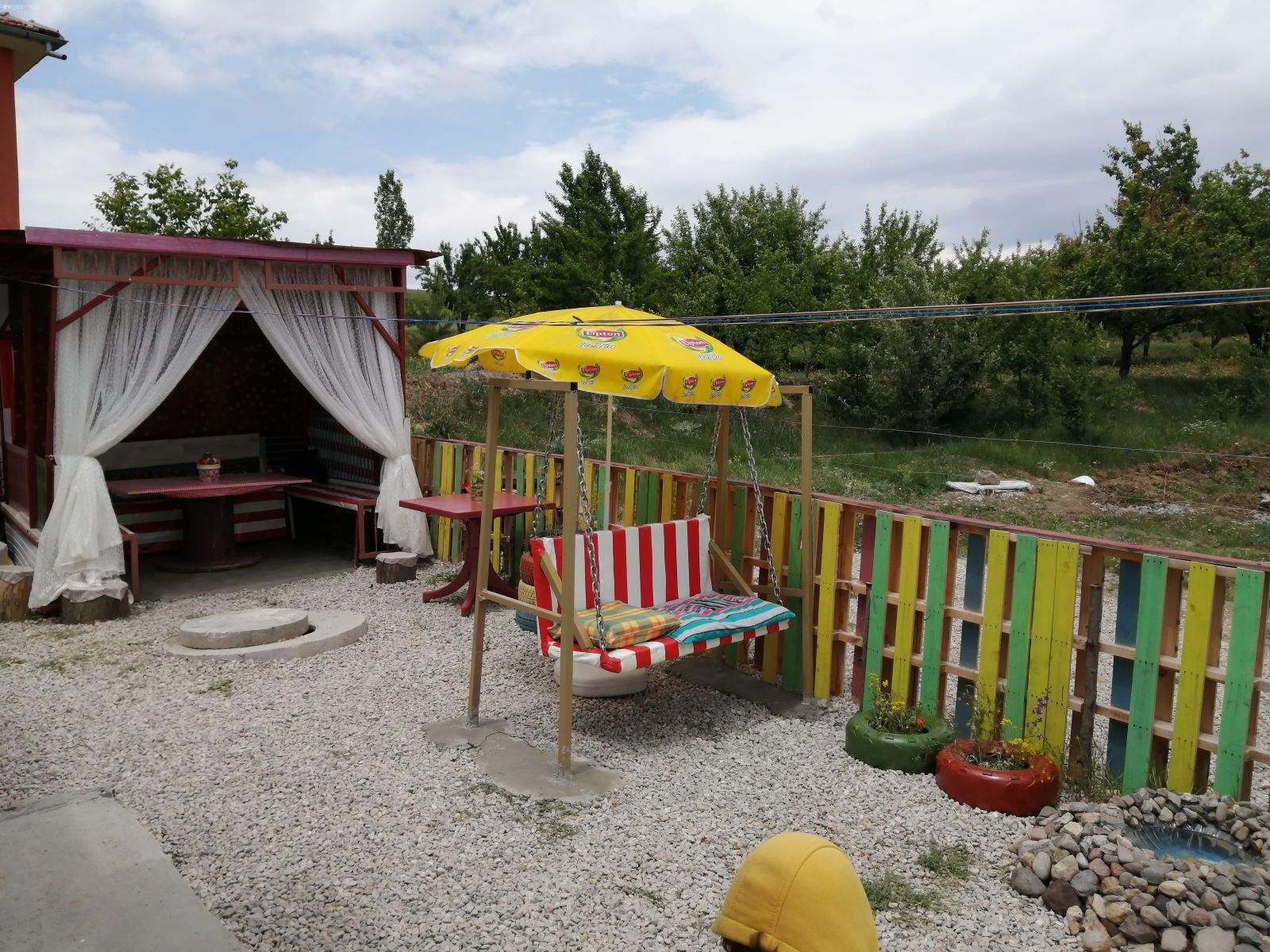 Küçük bir köy evi bahçemizi salıncak, kamelya yaparak kullanışlı bir hale getirdik. Geri dönüşüm malzemesi kullanarak eski oto lastiklerini boyayıp çiçeklik yaptık. Eski lastiği kullanarak etrafını taslar ile doldurarak süs havuzu yaptık. Paletleri çit yapıp renkli boyadık.