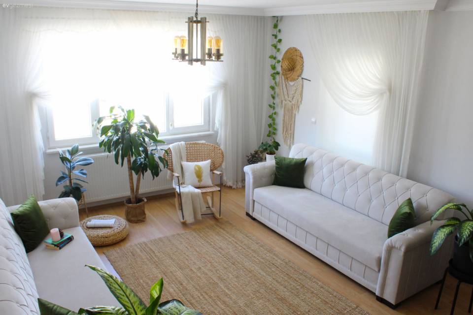 Mutfak ve banyo dışında salonunda da değişiklikler yapan Sevgi Hanım, retro görünümde olan salonunu İskandinav esintileriyle buluşturmuş. Nötr ve canlı renk tonlarının uyumuyla güzelleşen bu alan, konfor kriterini de es geçmemiş.