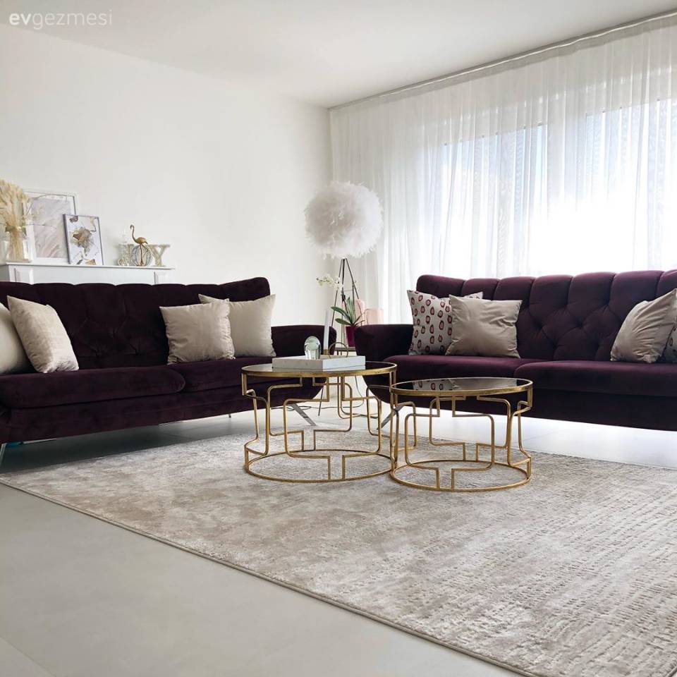 Sakin görünümlü salonun sıkıcı olmaması için biraz harekete ihtiyaç var! Bunun farkında olan Sena Hanım, mobilya ve aksesuar detaylarında metal kullanarak gerekli hareketi sağlamış.