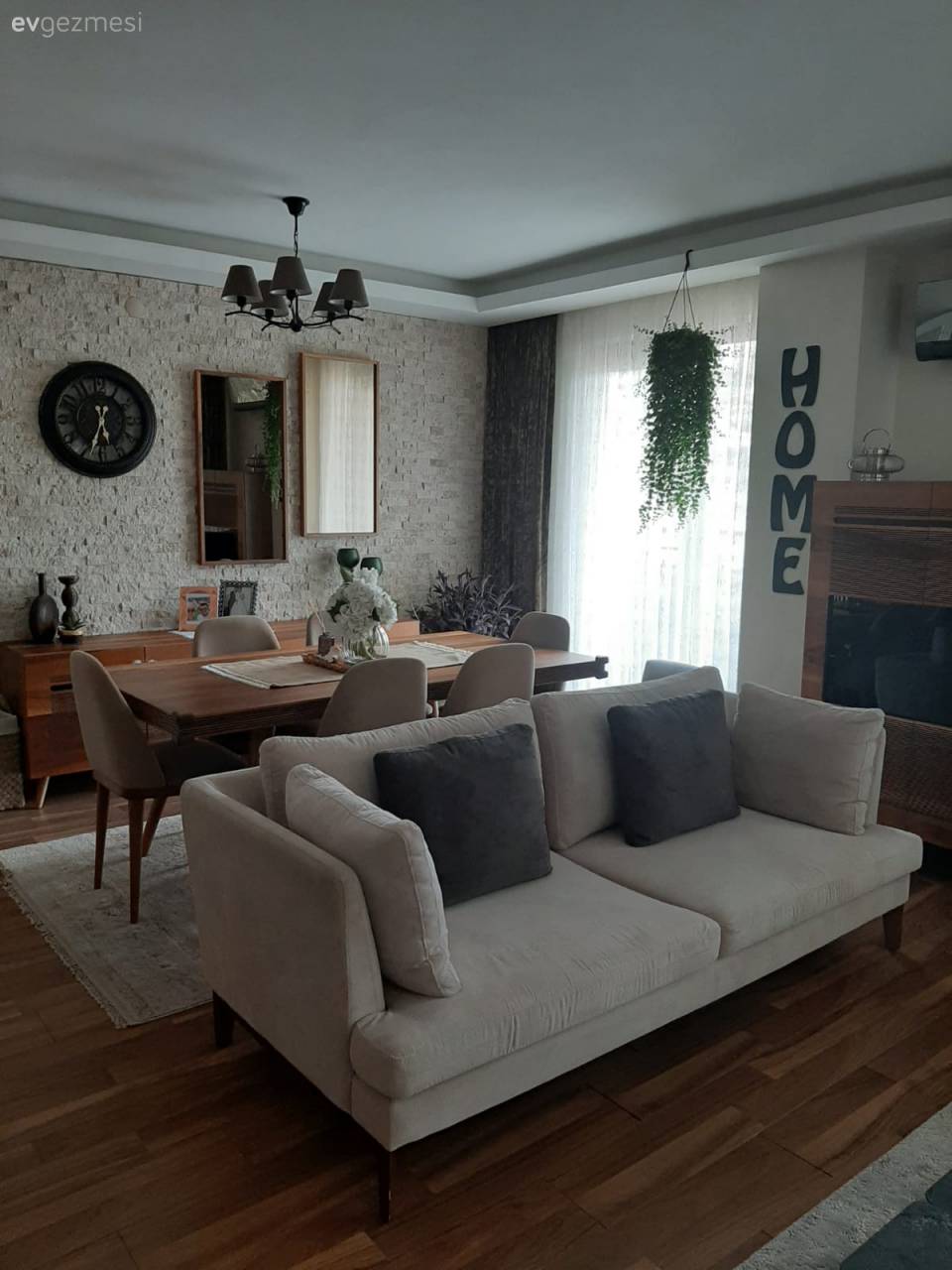 Krem ve griden oluşan renk paleti, salona dingin bir hava katmış. Detaylarda kullanılan ahşap ve metallerle de, sakin dekora hareket gelmiş.
