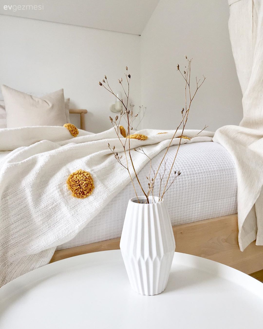 Yatak odasına gelince modern tarzına bohem esintiler de katan Elif Hanım, ahşap yatak tercih etmiş. Dört tarafı ahşapla çevrilen yatağın ayak ucunun askı olarak kullanılması da işin ayrı bir güzel tarafı!