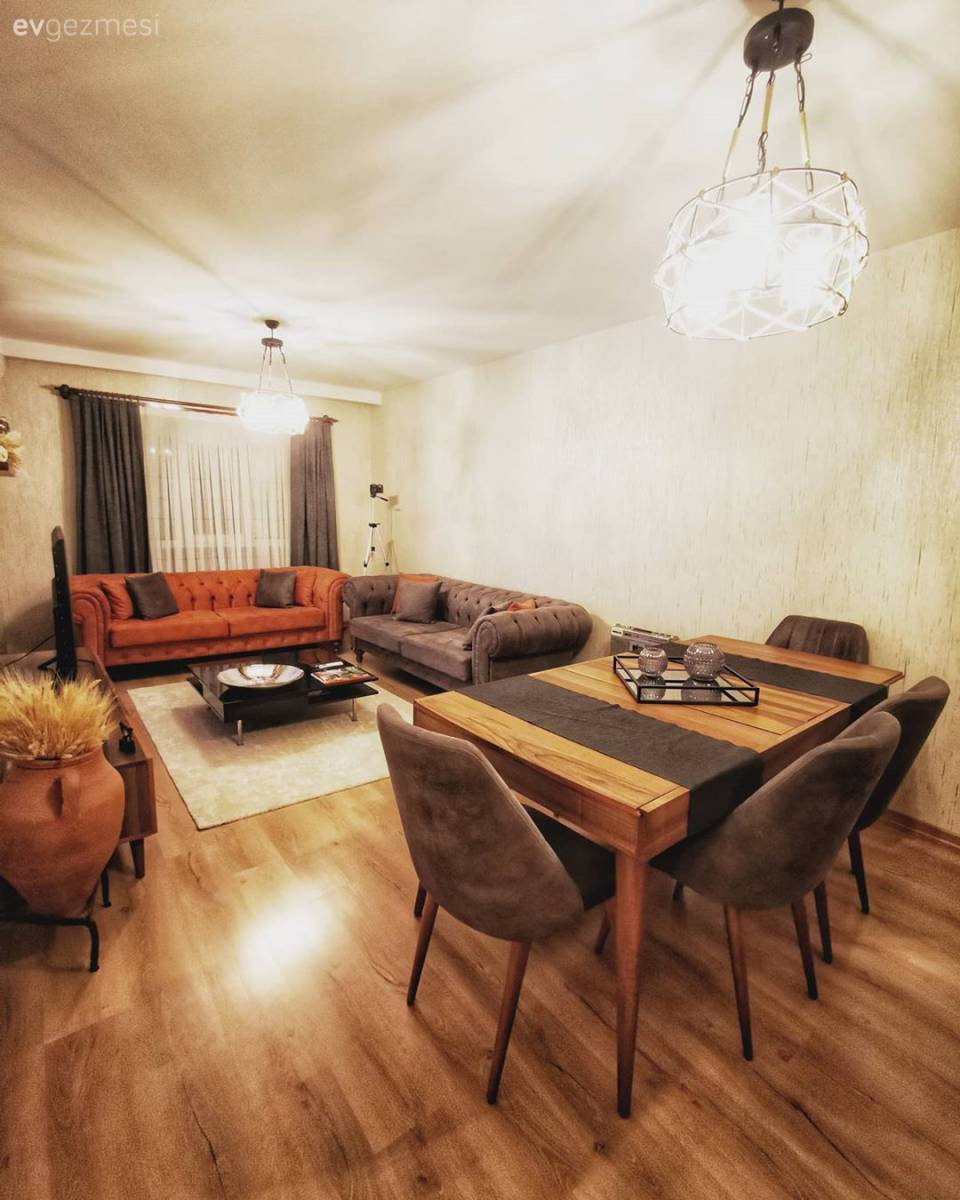 Yemek bölümündeki duvarı griye boyayan ev sahibimiz, üstüne bir de ayna kondurmuş. Aynaların alana kattığı aydınlık görüntü, oturma bölümündeki aksesuarlarla da uyum sağlamış.