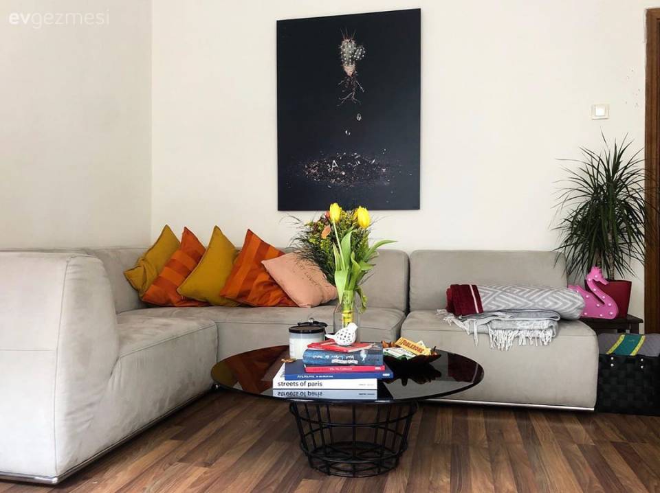 Konforlu iki kanepenin seçildiği dekor için bir de berjer kullanılmış. Bu şekilde oturma ihtiyacına hizmet eden parçalar tamamlanmış.