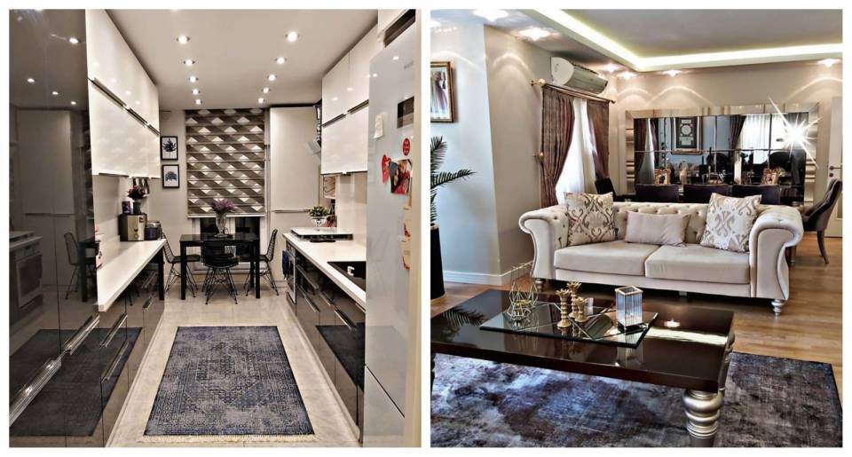 Mutfak, Beyaz, Gri, Mutfak tezgahı, Mutfak tezgah arası, Tezgah arası seramik, Mutfak halısı, Tül perde, Perde, Mutfak masası, Sandalye, Mutfak Avize Modelleri