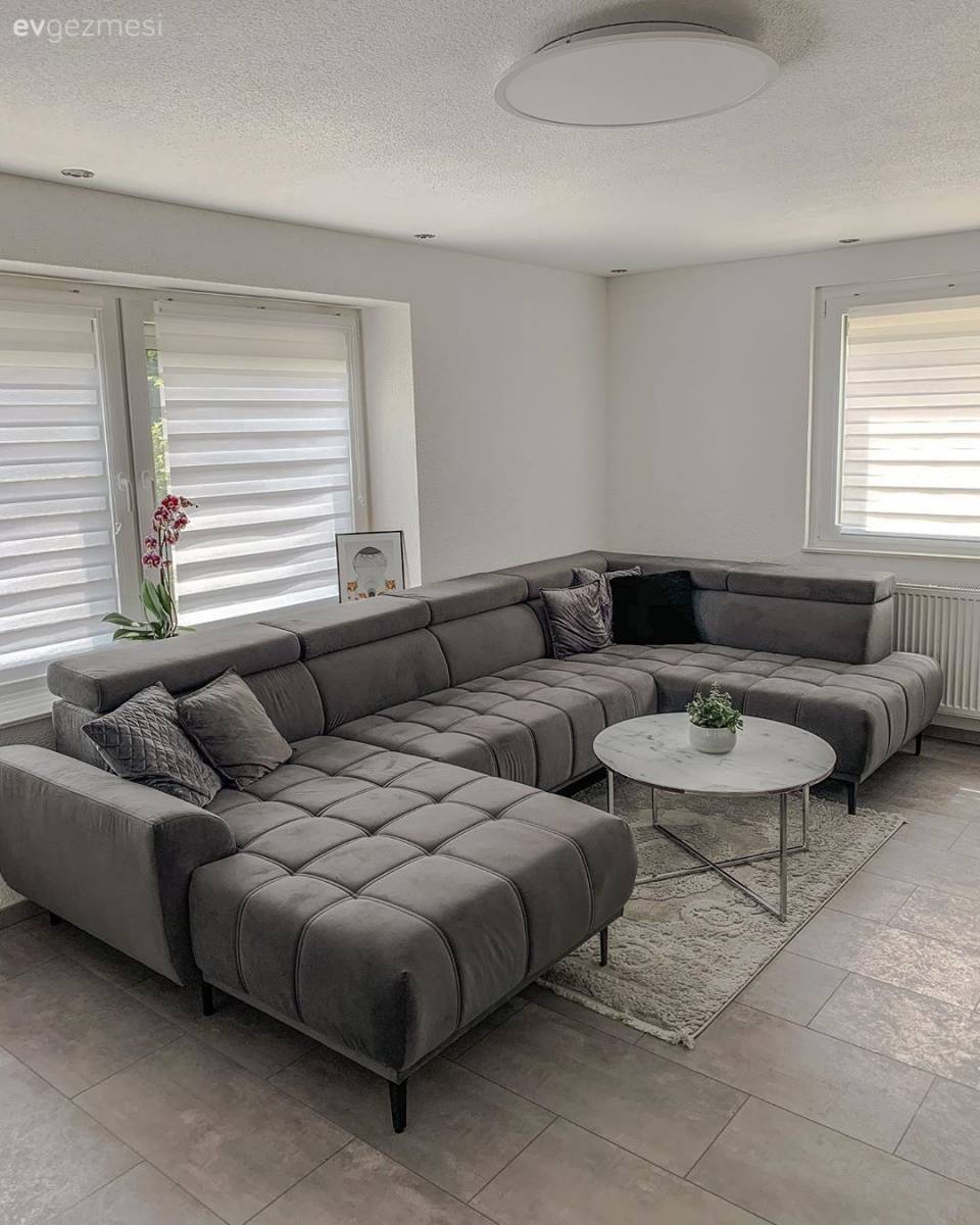 Mutfaktan sonra bizi karşılayan salon, daha çok modern stile göz kırpmış. Ama sade bir modernlik değil, içinde ışıltıyı da barındıran bir şekilde!