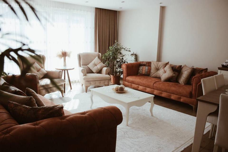 Mutfaktan sonra uğradığımız salon da tarz olarak rustik stilden kopmamış. Ama bu defa işin içine modern dokunuşları da dahil etmiş.