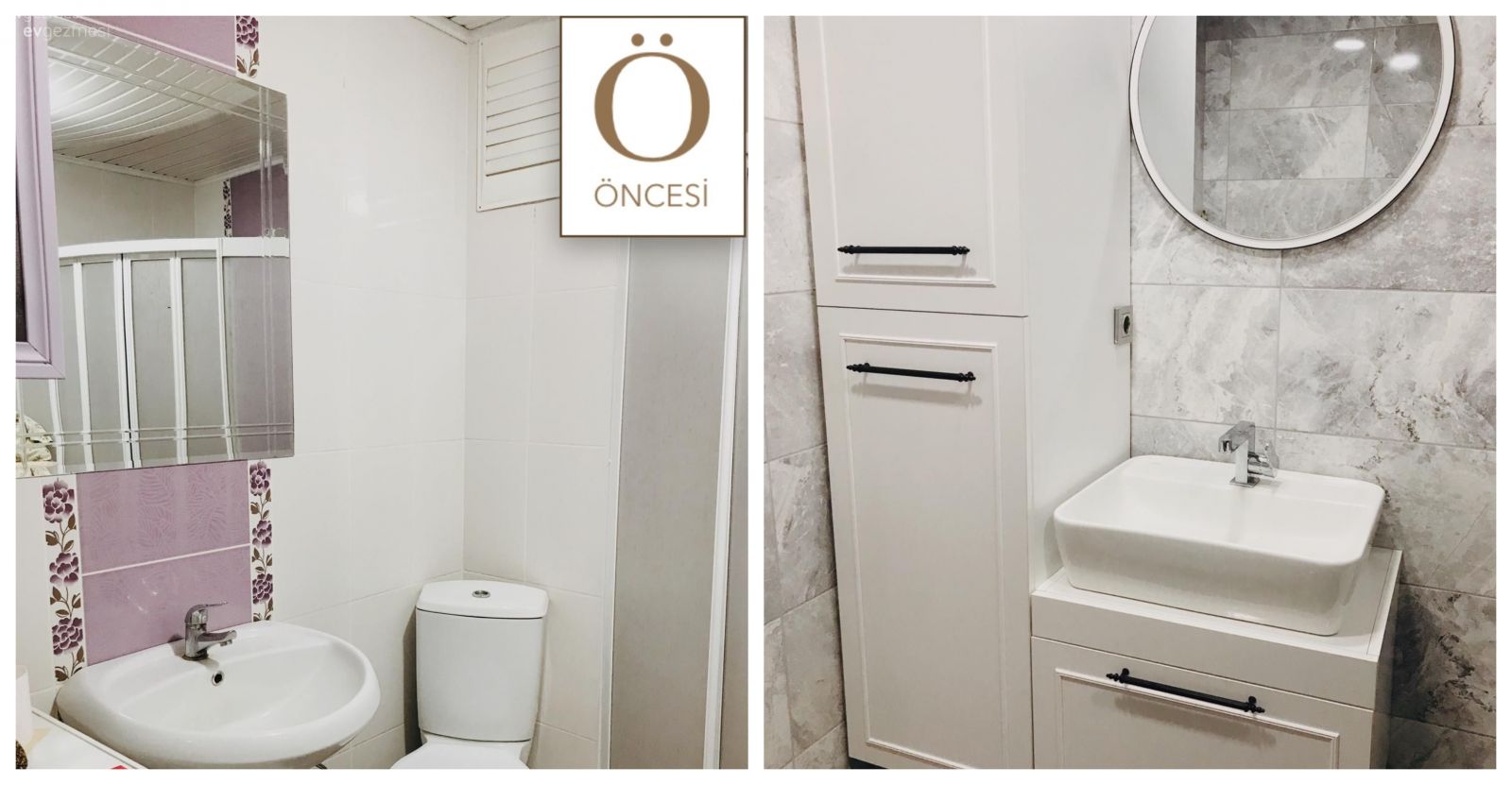 İlk etapta banyonun zemini değiştirilmiş. Sonrasında da eskiye dair ne varsa kaldırılmış: Yeni dolaplar, yeni duşakabin ve birçok detay alana dahil edilmiş.