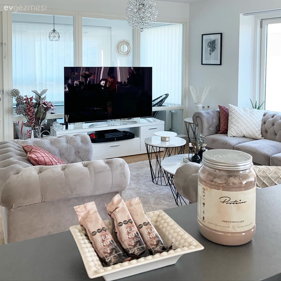 Beyaz, gri ve füme tonundan oluşan renk paleti, salonun uyumlu bir halde görünmesini sağlamış. Metal detaylar da ortama natürellik katmış.