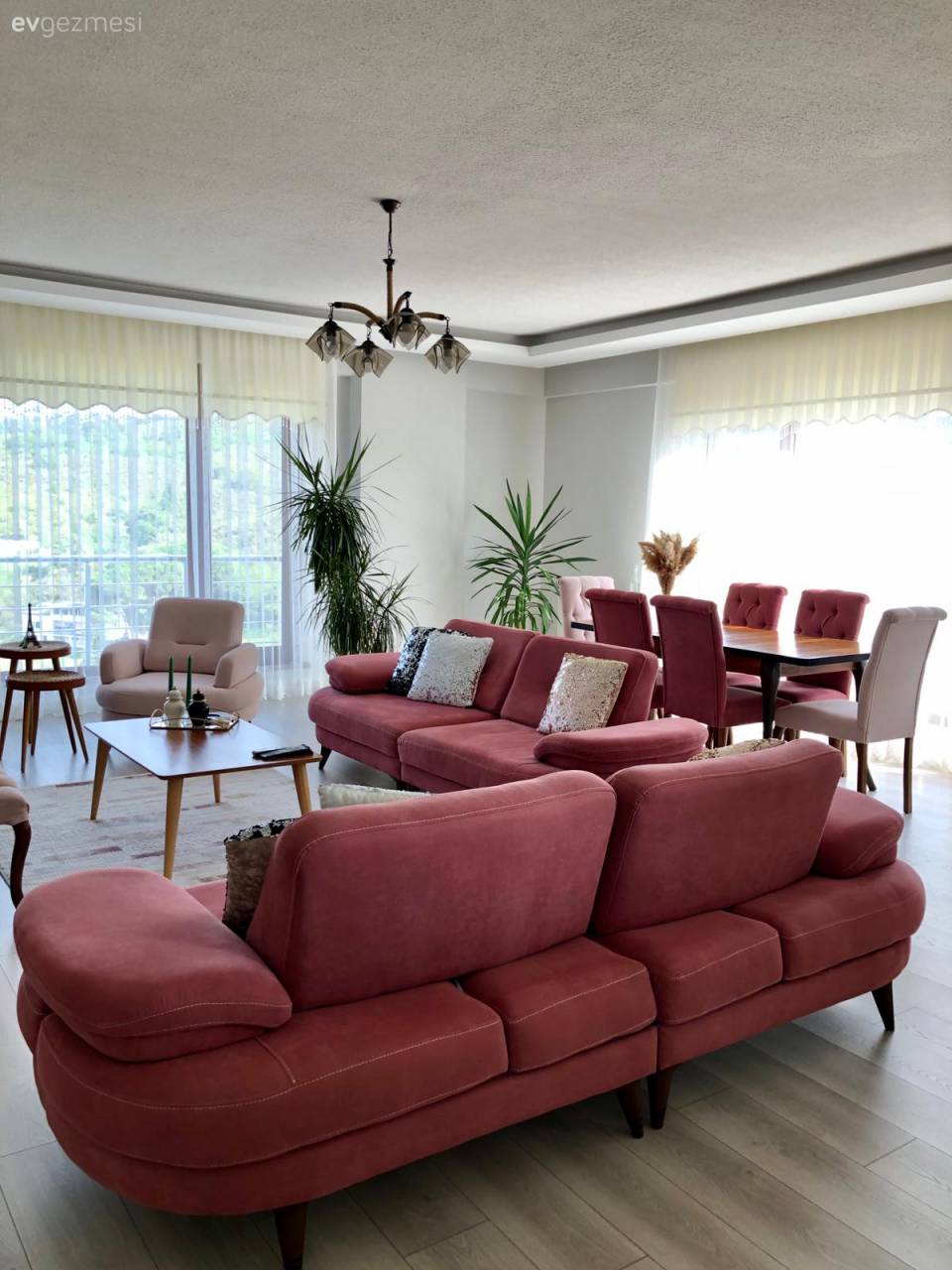 Ortamın ayrı bir kısmında oluşturulan yemek bölümü de modern stilin etkisi altında! Gri sandalyeler ve beyaz mermer görünümlü masa, salonun şıklığını olduğu gibi devam ettirmiş.