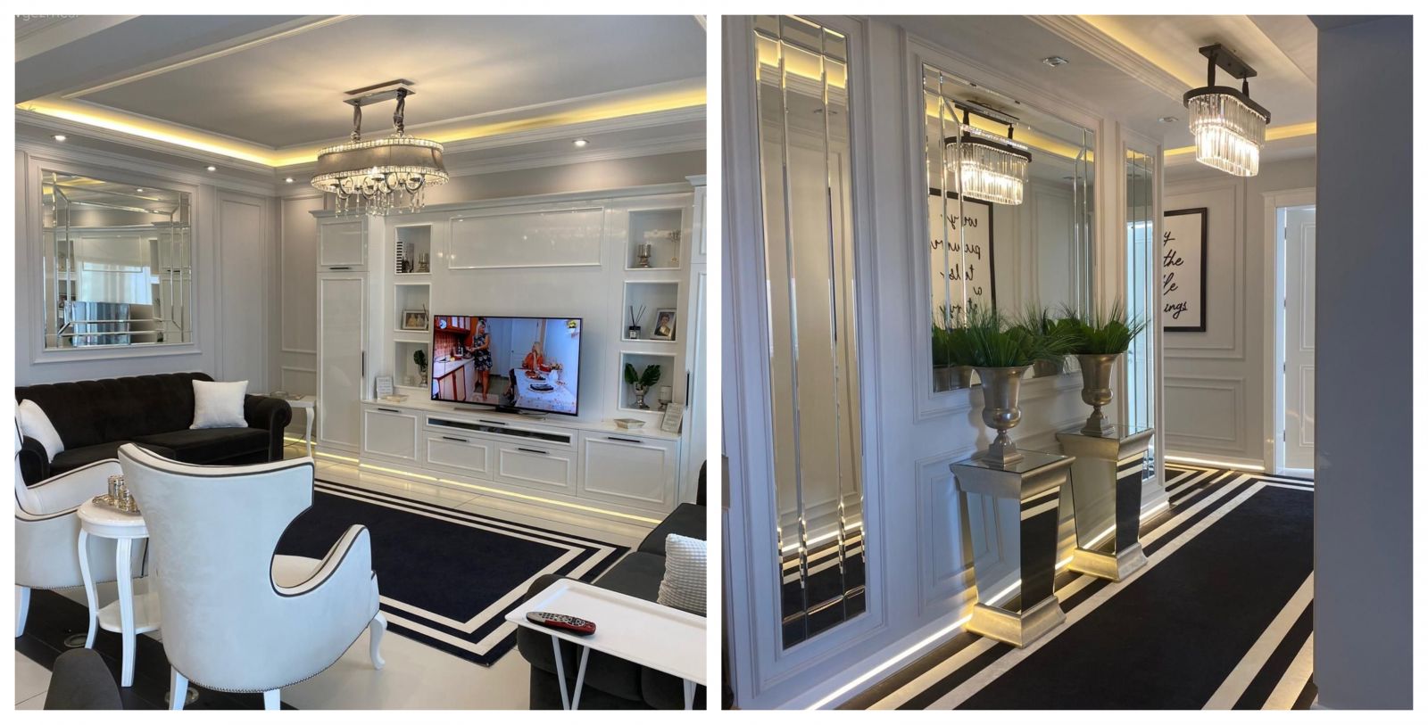 Gösterişli bir alan isteyen ev sahibi, dekorun genelini ışıltılı nüanslarla doldurmuş: Parlak yüzeyler, geniş alanları kaplayan açık tonlar, aynalar ve yoğun aydınlatmalar evin ışıldamasında söz sahibi olan kahramanlar...