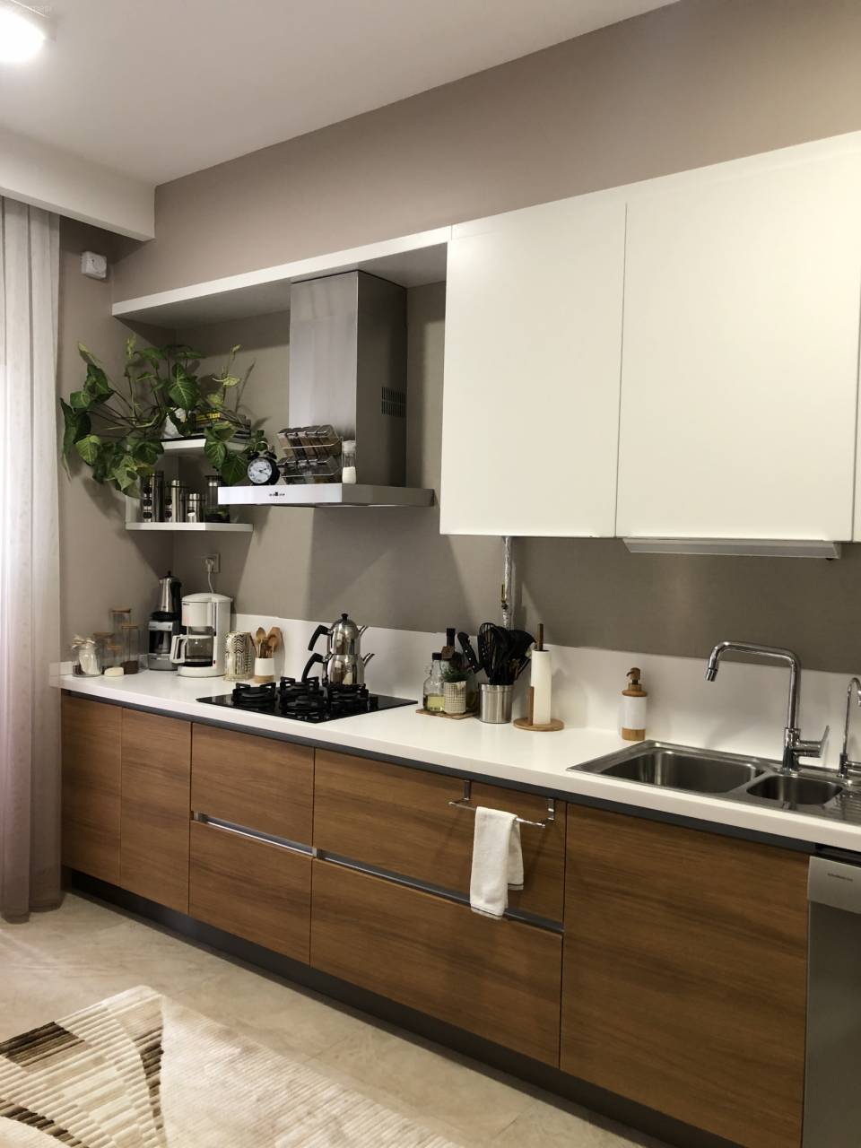 Salon dışındaki her alanda özenli tavrını koruyan ev sahibimiz, gri dolaplı mutfağında çizgili duvar kağıdı ile farklılık sağlamış.