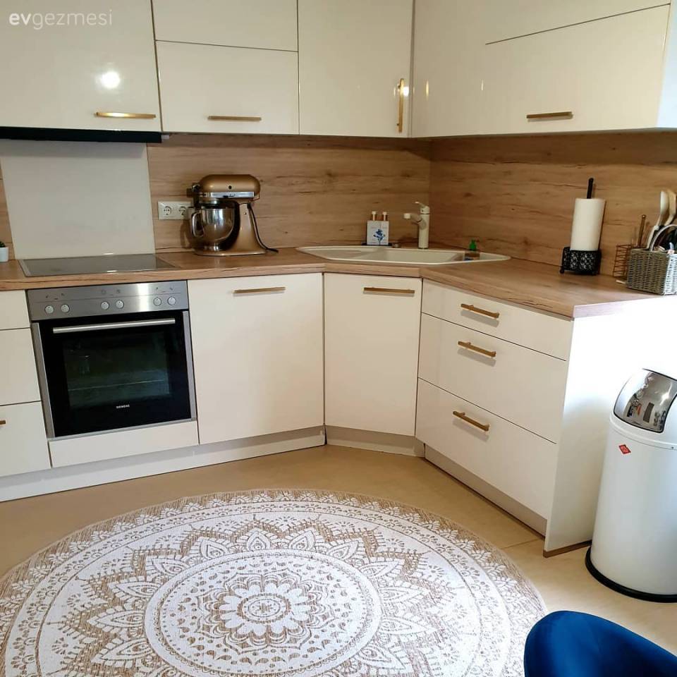 Mutfağın tamamını ele geçiren beyaz renk, yanına vurgu detaylarda siyahı almış. G tipi tasarlanan bu mutfak, ferah ve kullanışlı haliyle ev sahibimizin içine çok sinmiş.