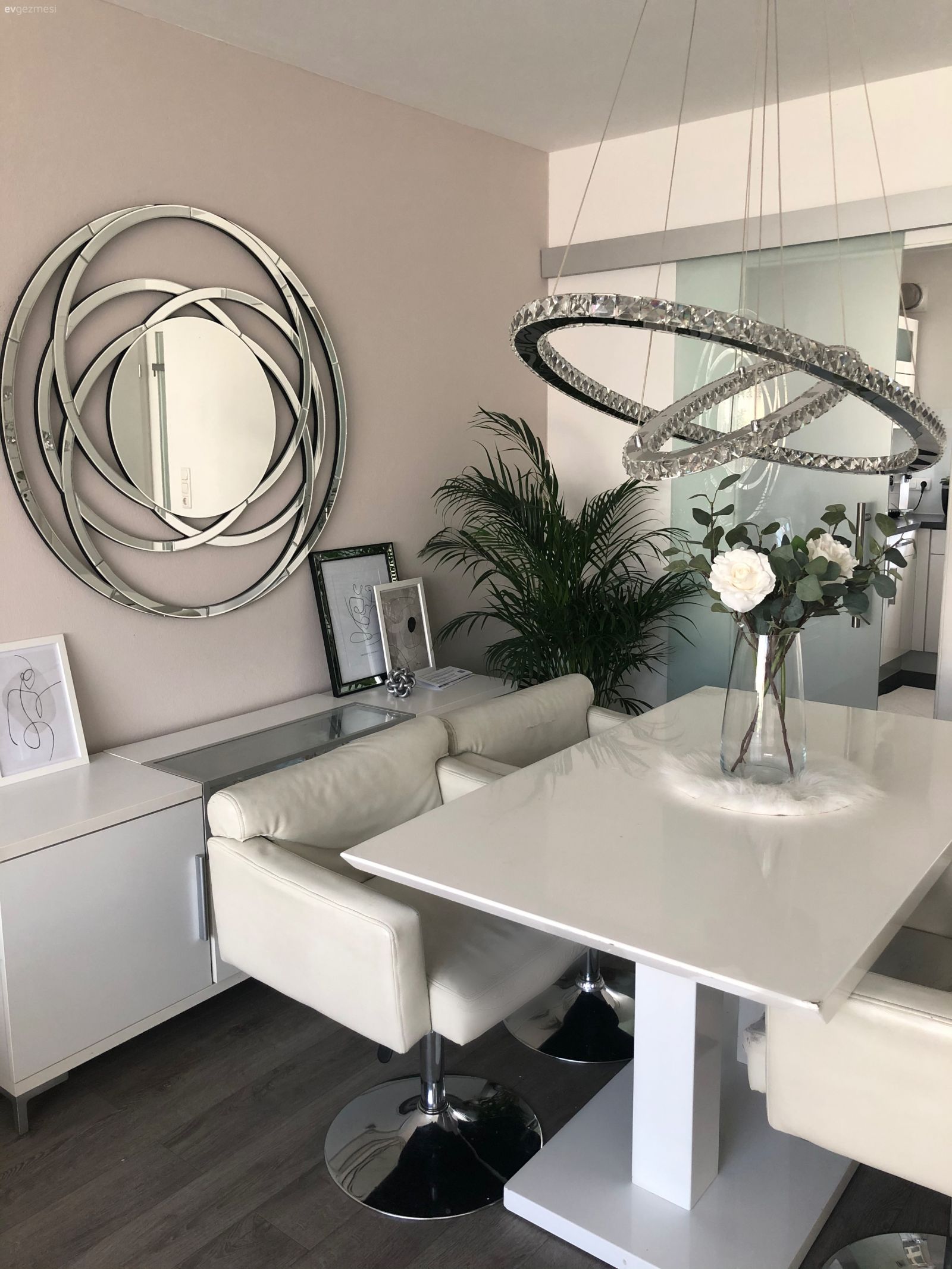 Pınar Hanım'ın yemek alanı evin en çok ışıldayan bölümü: İkonik tasarıma sahip taşlı avize ve halka formundaki ayna, bu bölümün en çarpıcı parçaları!