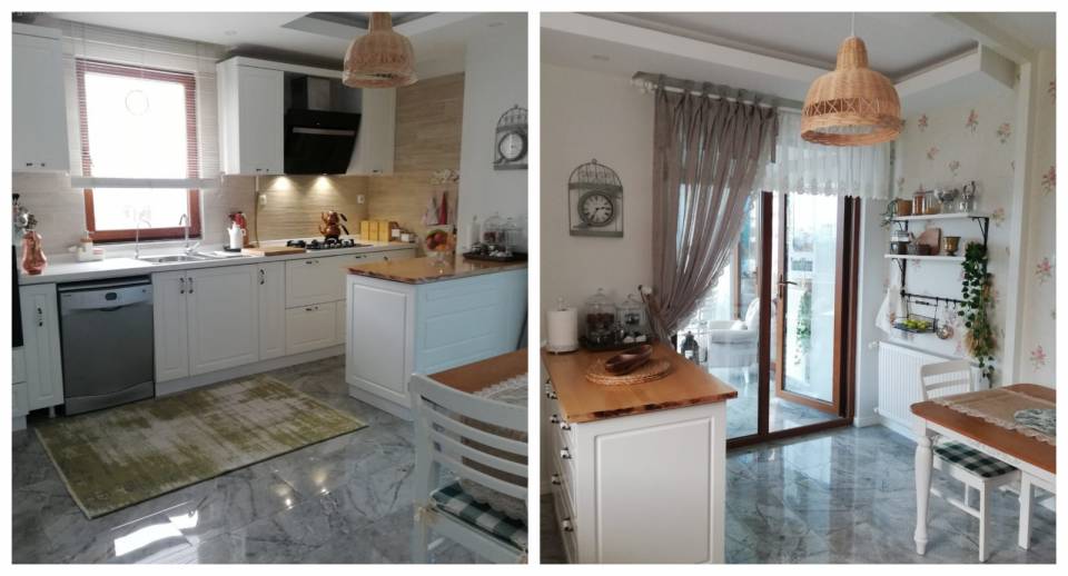 Mutfak, Beyaz ve ahşap mutfak, Ahşap mutfak tezgahı, Mutfak tezgahı, Mutfak tezgah arası, Mutfak halısı, Ekstra mutfak dolabı, Ankastre
