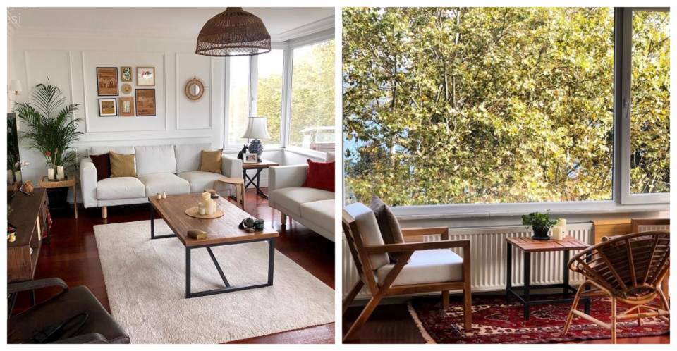 Konfor konusunda üstüne tanımayan köşe koltuk, salonun merkezine yerleştirilmiş. Köşe koltuğu tamamlamak için de ahşap ağırlıklı mobilyalar tercih edilmiş.