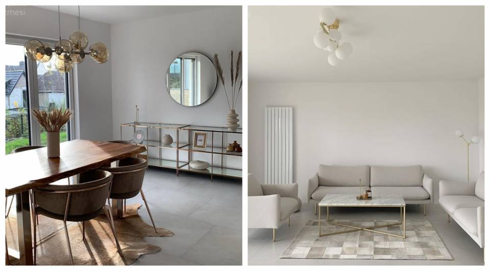 İki katlı evin salonunda konforun ön planda olduğu mobilyalar tercih edilmiş. Daha çok açık renkleri üstünde taşıyan bu parçalar, ahşap detaylarla da natürelliği dekora taşımış.