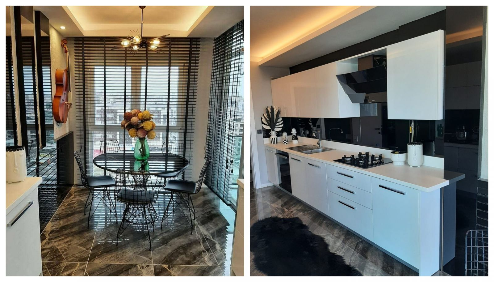 Beyazın ferahlığını alan mutfak dolapları, koridor tipi uzanan bu alanan karşılıklı iki tarafında kullanılmış.