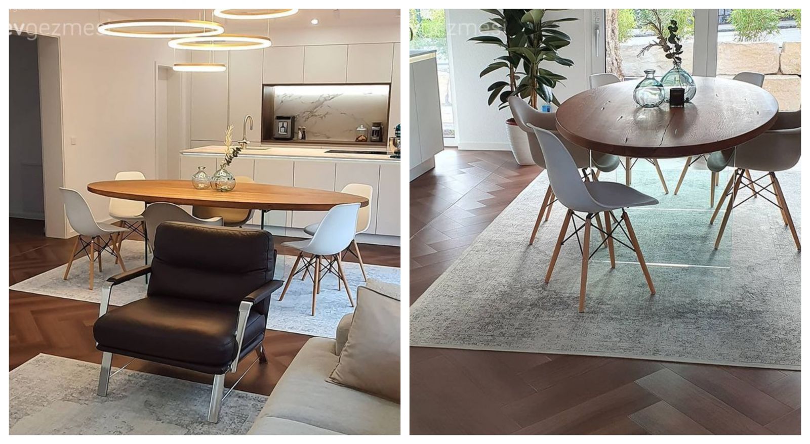 Mutfak ile oturma alanı arasında duran yemek masası, oval formlu bir şekilde seçilmiş. Üstünde yer alan yuvarlak avizeler düşünüldüğünde bu çok d yerinde bir tercih olmuş.