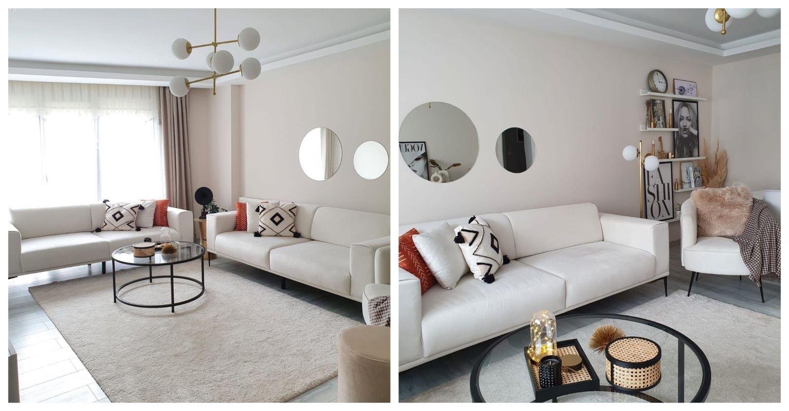 Salon, Modern, Beyaz koltuk, Koltuk takımı, Turuncu, Kırlent, Ev tekstili, Halı, Salon halısı, Orta sehpa, Sehpa, Fon perde, Perde, Tül perde, Yuvarlak ayna, Dekoratif ayna, Avize, Aydınlatma, Salon avizesi, Puf