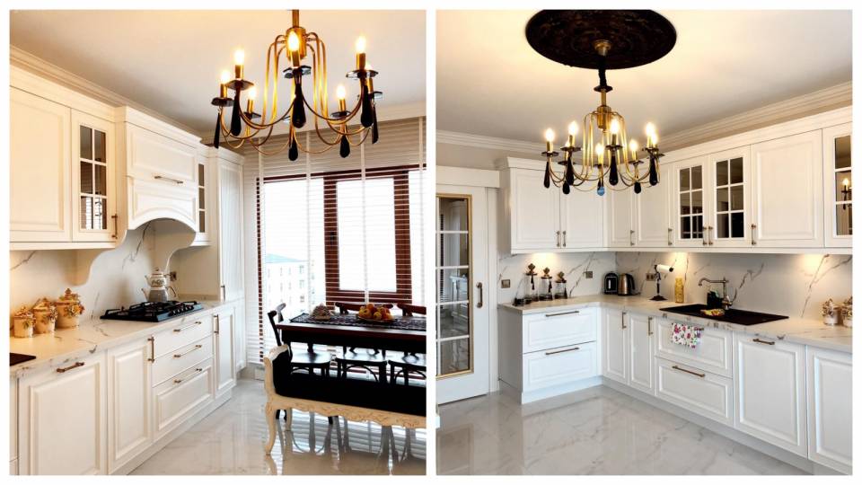 Mint yeşili sandalyeler ve altın yansımalarıyla hareketlenen mutfak, duvarda yer alan tablo ile iyice görünürlük kazanmış.