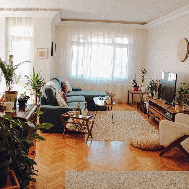 Çok fazla eşyanın kullanılmadığı evde, koltuk ve sehpa dışında ihtiyacı karşılayan bir tv ünitesi kullanılmış. Bir de çok amaçlı görev yapan puf!