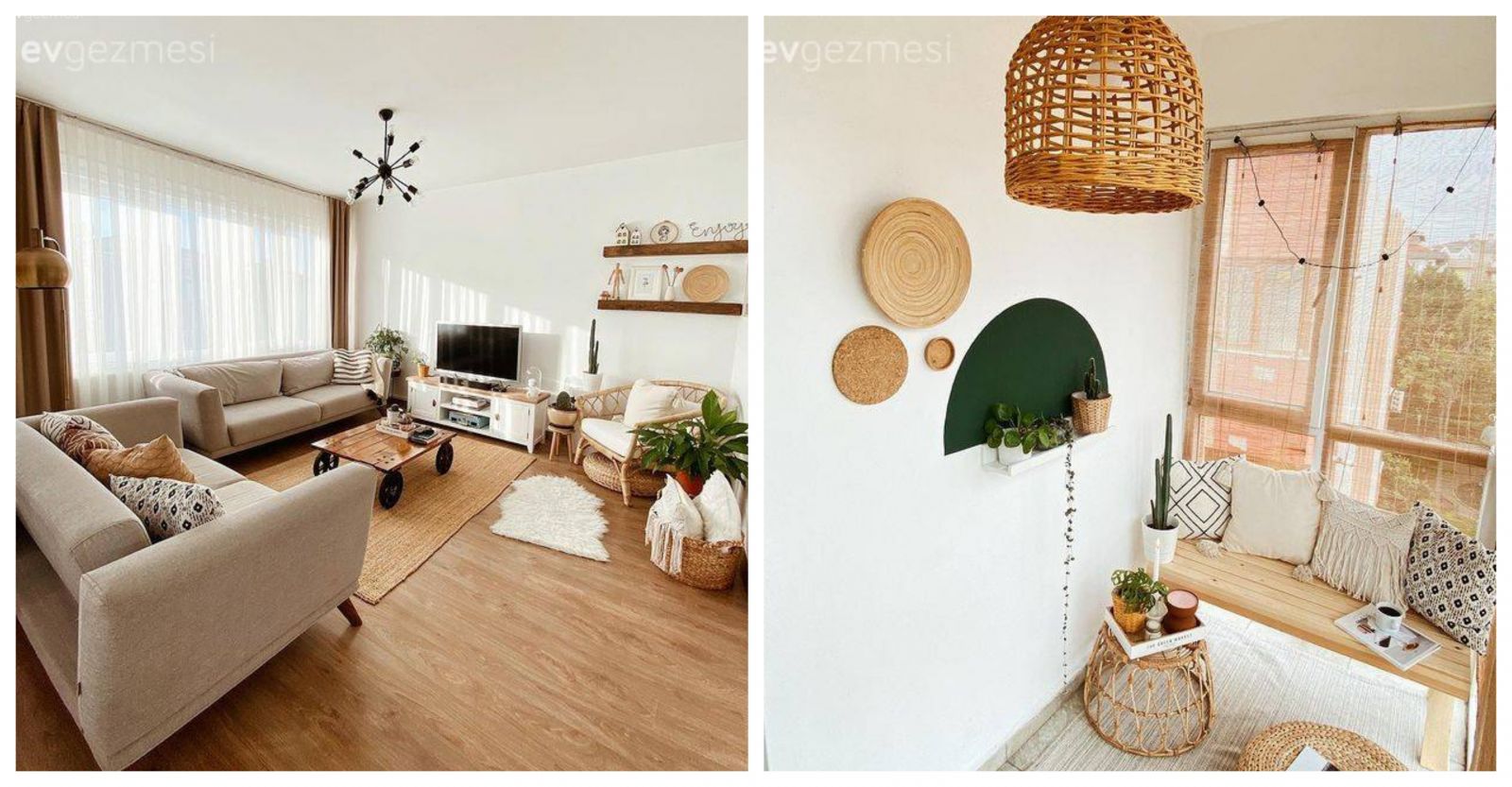 Salon, Bohem Dekorasyon, Beyaz, Kahverengi, Krem, Bej, Duvar rafı, Duvar dekorasyonu, Çerçeve, Komodin, Hasır sandalye, Parke, Tv ünitesi, Tv ünitesi aksesuarları, Ev Aksesuar, Orta sehpa, Sehpa