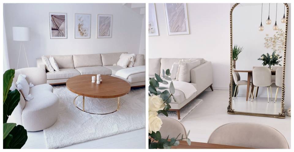 Yemek Odası, Beyaz, Ahşap Mobilya, Ayna, Yuvarlak ayna, Dekoratif ayna, Pampas otu, Vazo, Ev Aksesuar, Yan sehpa, Sehpa, Halı, Sandalye, Yemek masası