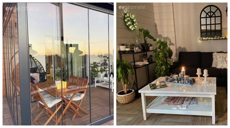 Kış bahçesi, Gri, Ahşap Mobilya, Mumluk, Ev Aksesuar, Pencere duvar dekoru, Duvar dekorasyonu, Bahçe masası, Kırlent, Ev tekstili, Zemin seramikleri