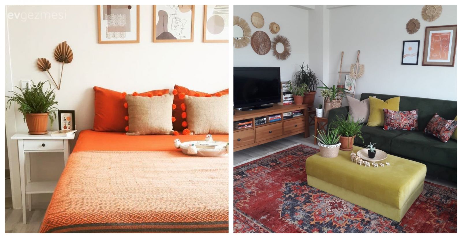 Yeşilin farklı tonları, kırmızılar ve turuncular evin her odasında enerjiyi yüksek tuttmak için hazır bulunmuş.