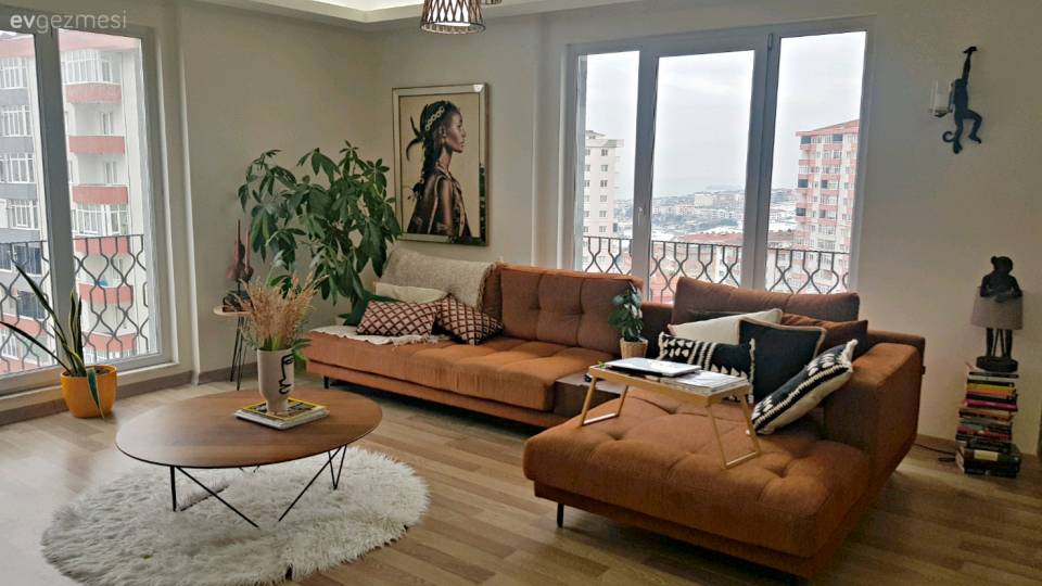 Kırlentler, duvar aksesuarları, hasır aynalar ve bolca bitki salona dahil edilerek enerjisi yüksek bir ortam oluşturulmuş. Tam da ev sahibinin istediği gibi!
