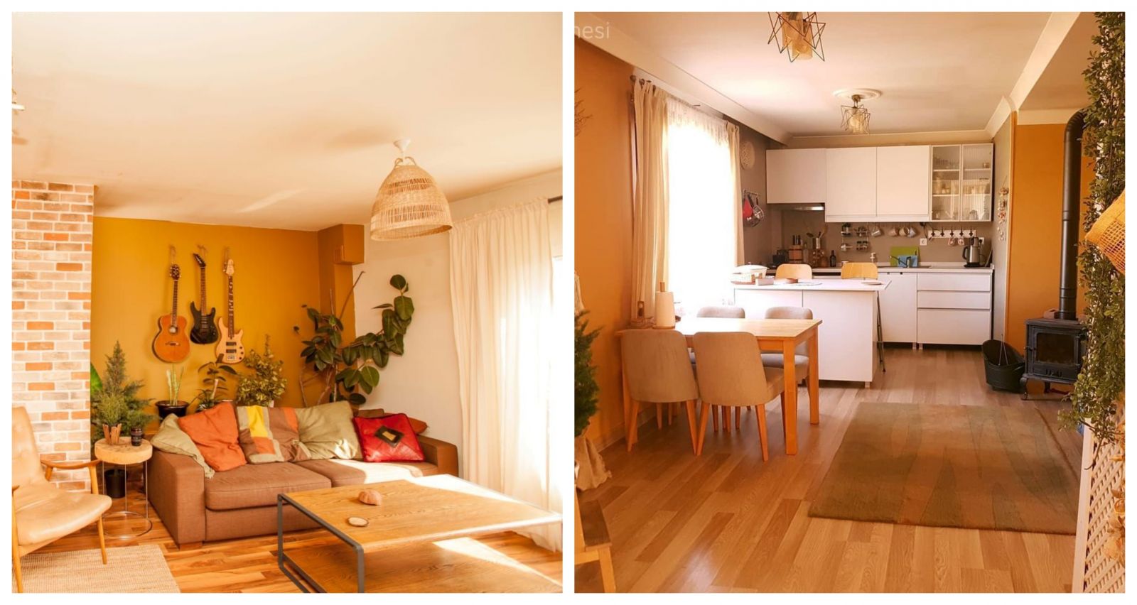 Bohem Dekorasyon, Rustik, Eklektik, Sarı, Turuncu, Krem, Bej, Ahşap Mobilya, Ev Aksesuar, Saksı, Hasır sepet, Ev bitkisi, Perde, Rustik perde, Berjer, Halı, Jüt halı, Pampas otu, Dekoratif Objeler, Beyaz