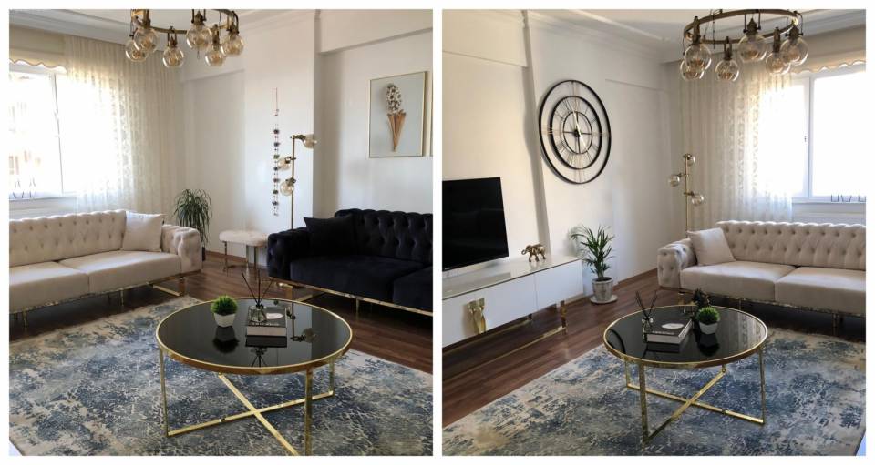Salona rahatlık katan Ikea koltuk takımı bembeyaz haliyle ferahlık kaynağı da olmuş. Onun yanına gelen orta sehpa ve diğer parçalar da beyazdan nasibini almış.