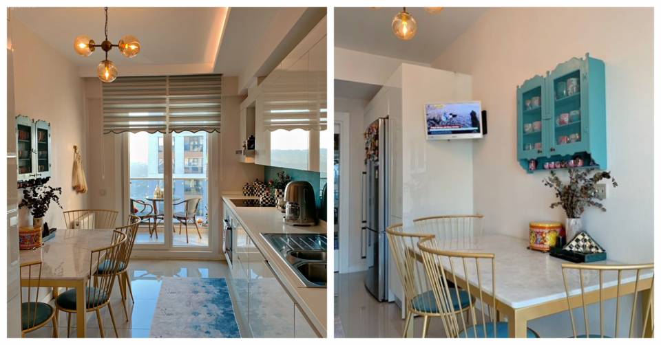 Salondan sonra bizi karşılayan mutfakta, Dilek Hanım beyazın baskın olmasını istemiş. Neredeyse tüm alanı kuşatan beyaz, yanına ahşap detayları almış. Bu sayede alan daha sıcak görünmüş.