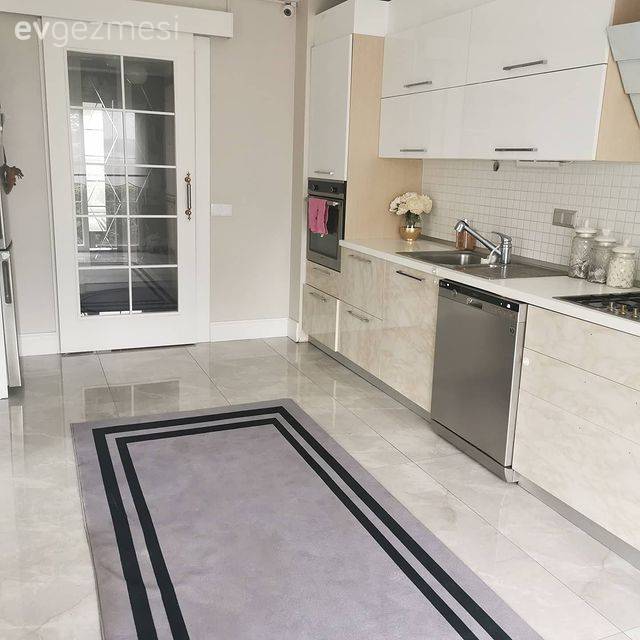 Koridor tipi uzanan mutfak alan olarak dar olduğu için tek bir ton ile ferahlık sağlanmış: Dolaplarda kullanılan renk tüm alana serpiştirilince alan daha akıcı hale gelmiş.