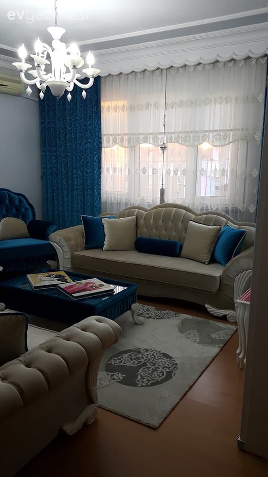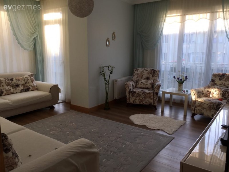 Eşinin bir oda da pembe olmasın ısrarı sonucu, salon daha sade seçimlerle, ağır bir görünümde..