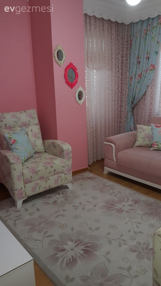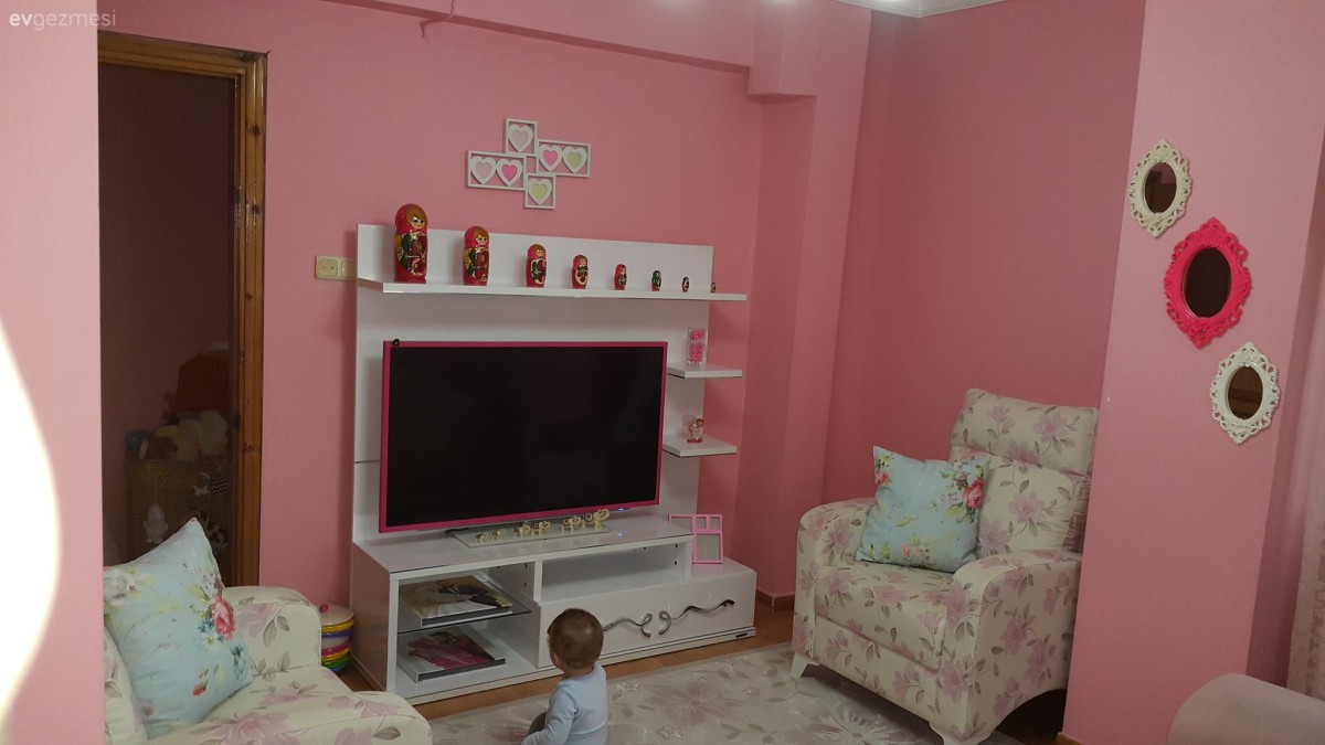 Canan hanımın pembe sevgisi oturma odasında da kendini gösteriyor..