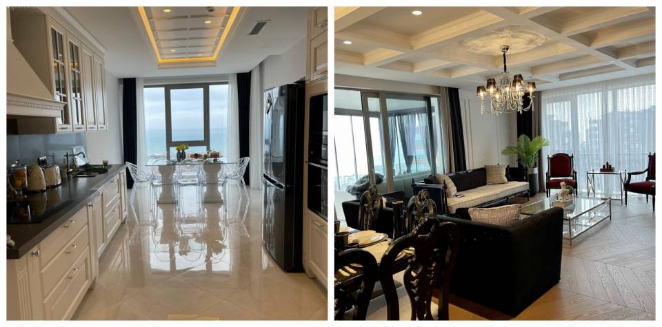 Geniş adaya sahip mutfak, yemek masası ve sandalyeler, kapı çerçeveleri ve daha birçok detay siyahın etkisi altında kalmış.