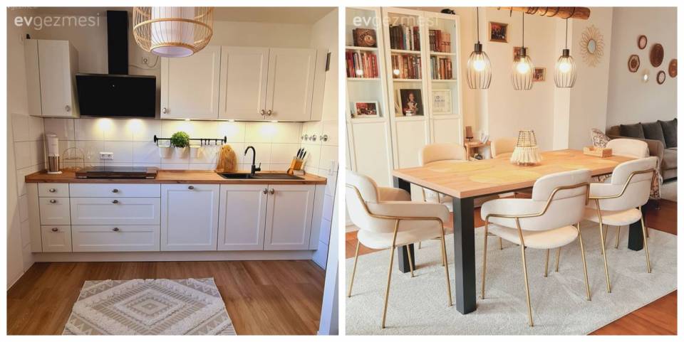 Salondan sonra bizi karşılayan mutfakta sıra! Bu alanda da hem renk hem de tarz olarak benzer bir yaklaşım sergilenmiş.