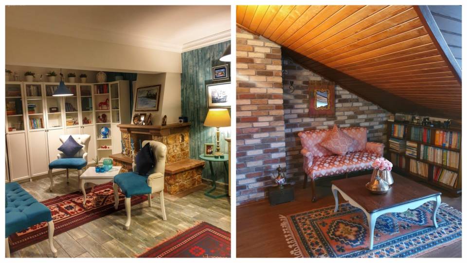 Dekor için seçilen mavi ve ekru uyumu da ahşaplardan yayılan sıcaklıkla daha çekici bir hal kazanmış.