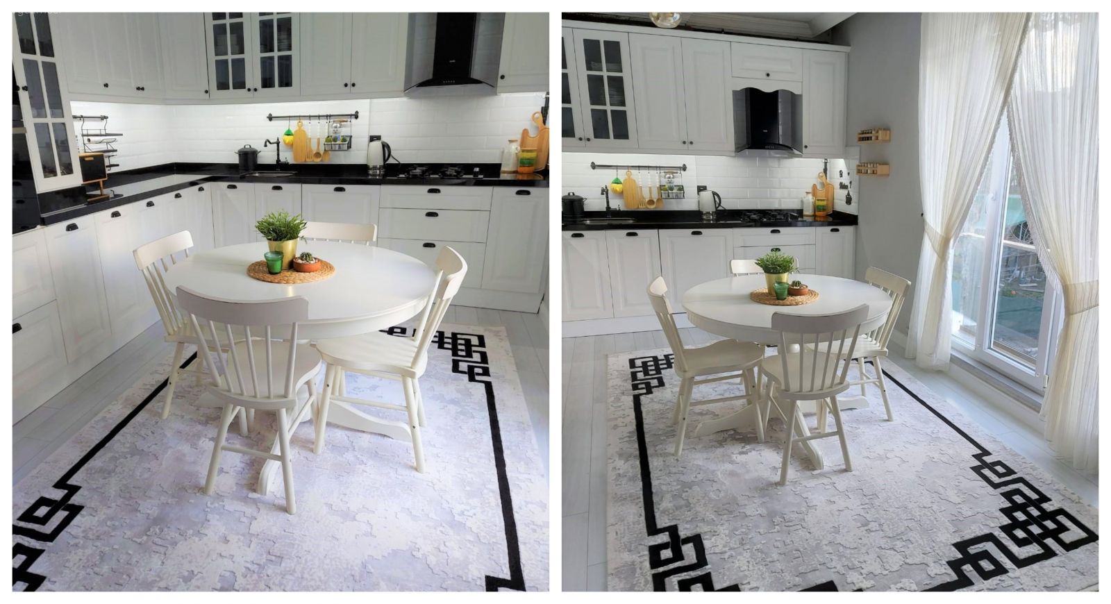Mutfak tezgahıyla alana dahil edilen siyah renk ankastreler ve halı desenlerinde de devam ettirilmiş. Her iki rengin yarattığı kontrast etki de mutfağın cazibesini arttırmış.