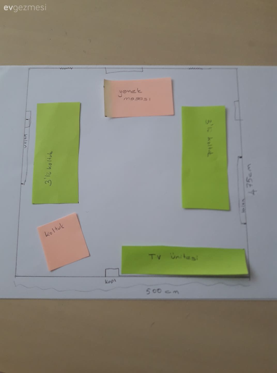 Yeni tasindigim evin salonu kare. 4.75 e 5 mt. Eşyaları yerleştirme konusunda yardımcı olur musunuz? Pencere boydan<br />
