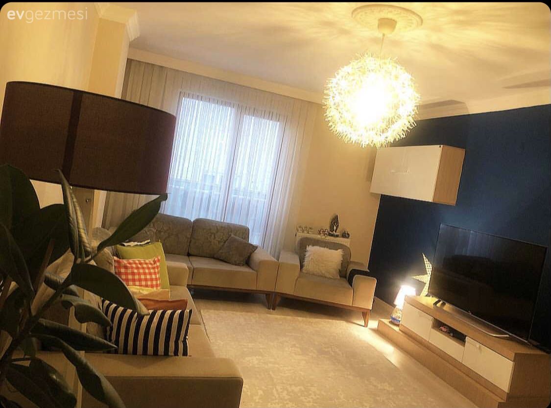 Salonumda ki tv ünitesi arkası mavi fon duvarım tamamen kendimin tasarladığı karışım bir renktir. Salonuma ve mobilyalarıma farklı bir hava kattı tüm renklerle uyumlu oldu ve enerji verdi. Cesur bir renk tercih ettim????????