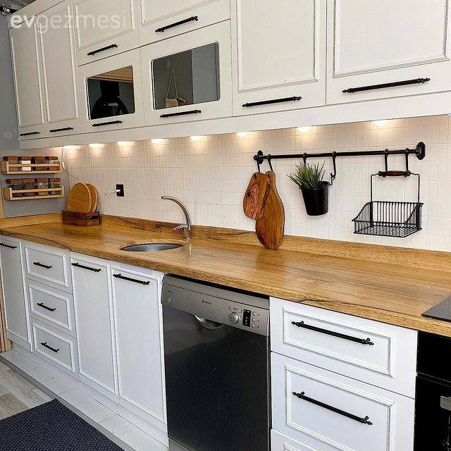 Mutfak, Koridor tipi mutfak, Beyaz, Siyah, Mutfak tezgahı, Mutfak tezgah arası, Tezgah arası seramik, Mutfak rafı, Ekstra mutfak dolabı, Mutfak halısı, Davlumbaz