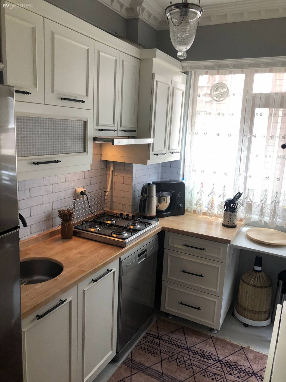 Mutfak, Country mutfak, Mutfak masası, Country mutfak masası, Spot aydınlatma, Halı, Madame Coco, Beyaz mutfak, Mutfak perdesi, Perde